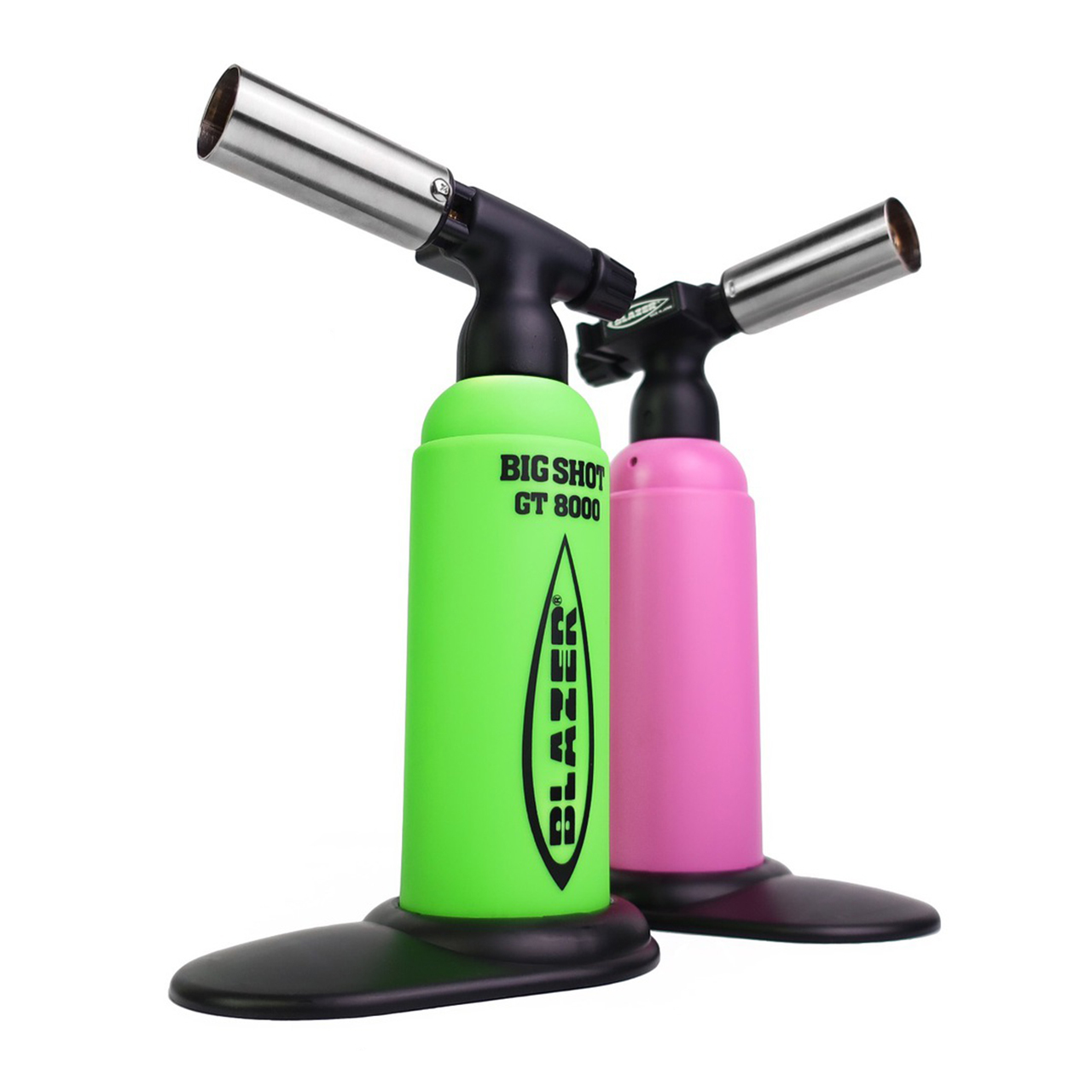 The Blazer GT8000 Big Shot butane torch is a refillable, gas torch with a brass frame nozzle, and attachable base. The torch creates a precise flame, emitting from a nozzle head, allowing direct heat application to an object. It is used for detailed purposes such as brazing, plumbing, soldering, jewelry making, and culinary, dental and lab applications.