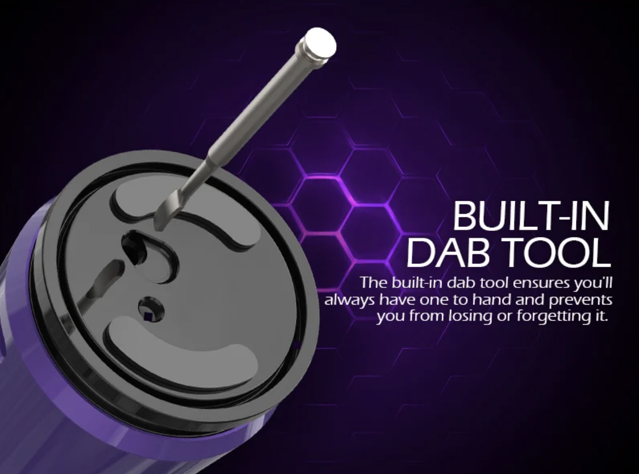 The battery base has a hidden dab tool that slides elegantly away when not needed. A single button allows you to turn the device on and off (with five clicks), adjust the temperature (with two clicks), and vape (press and hold the button).