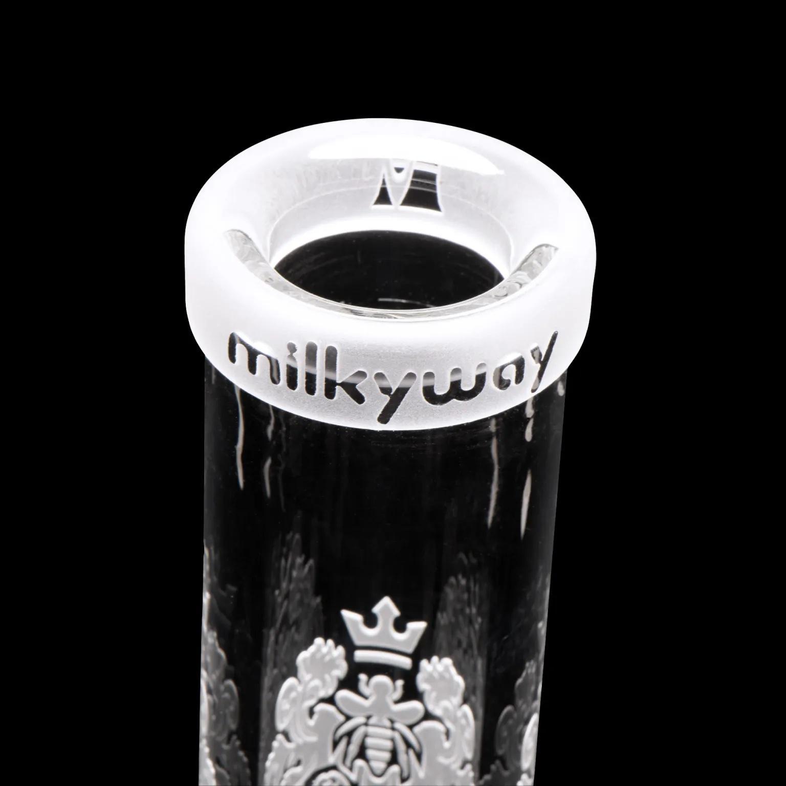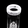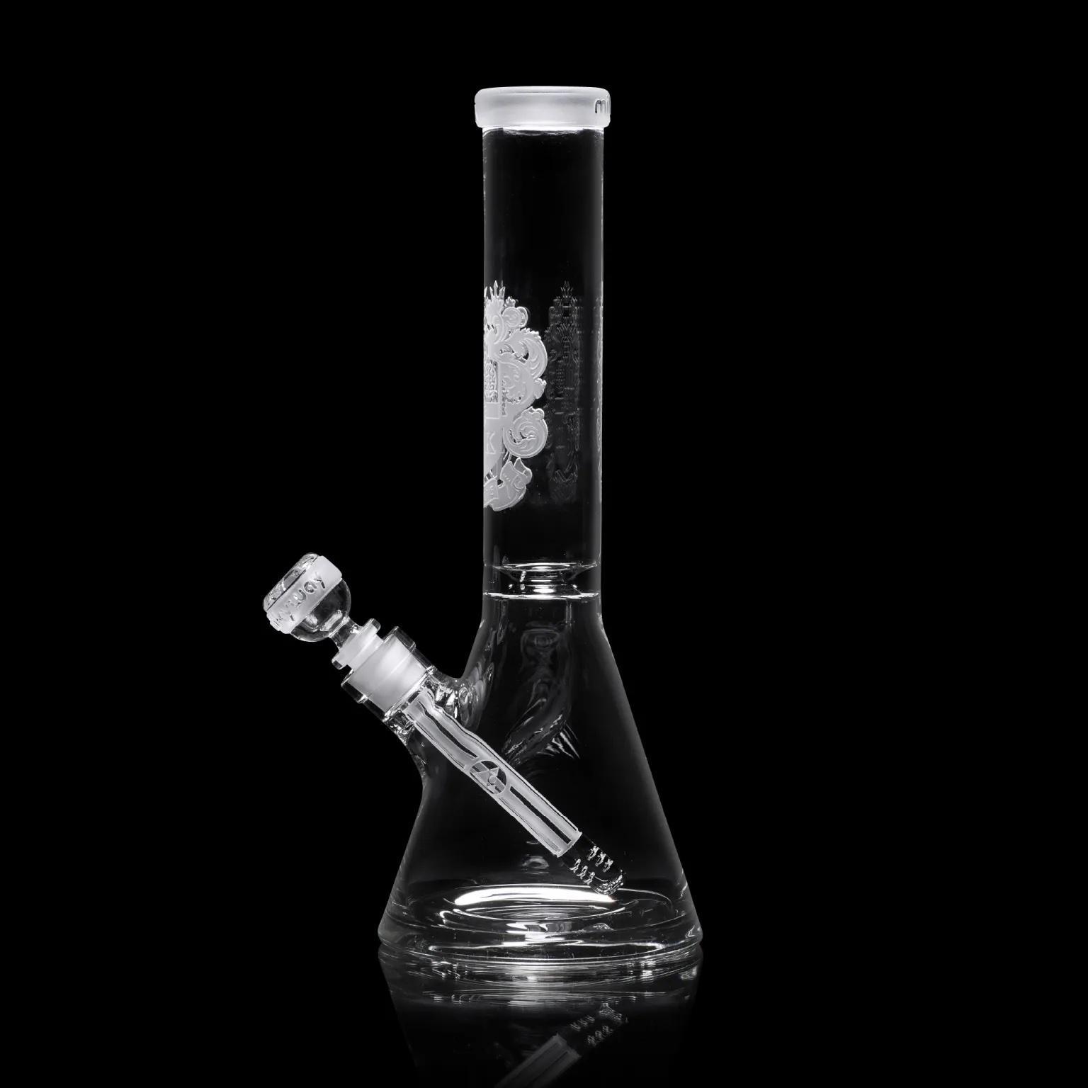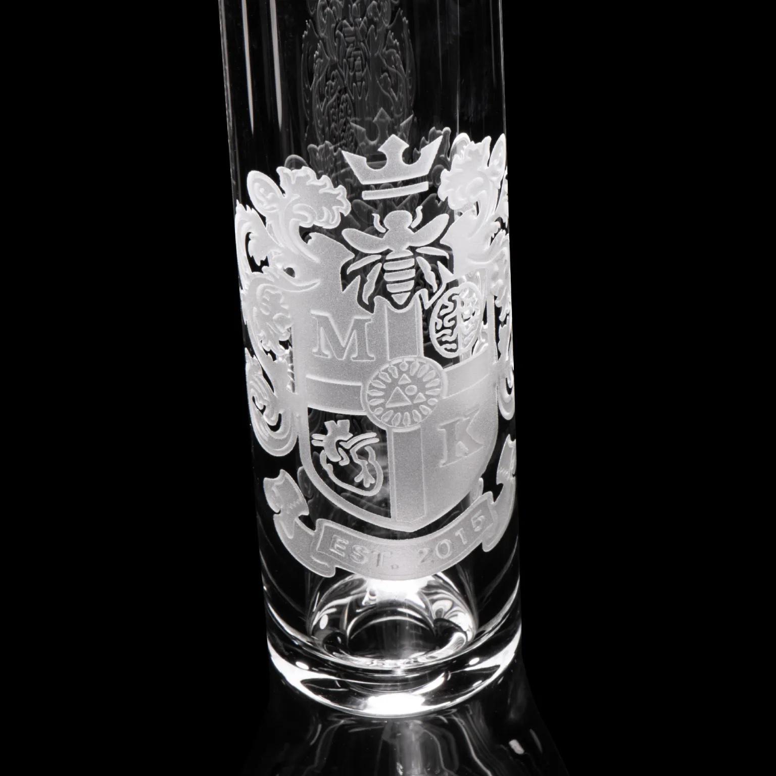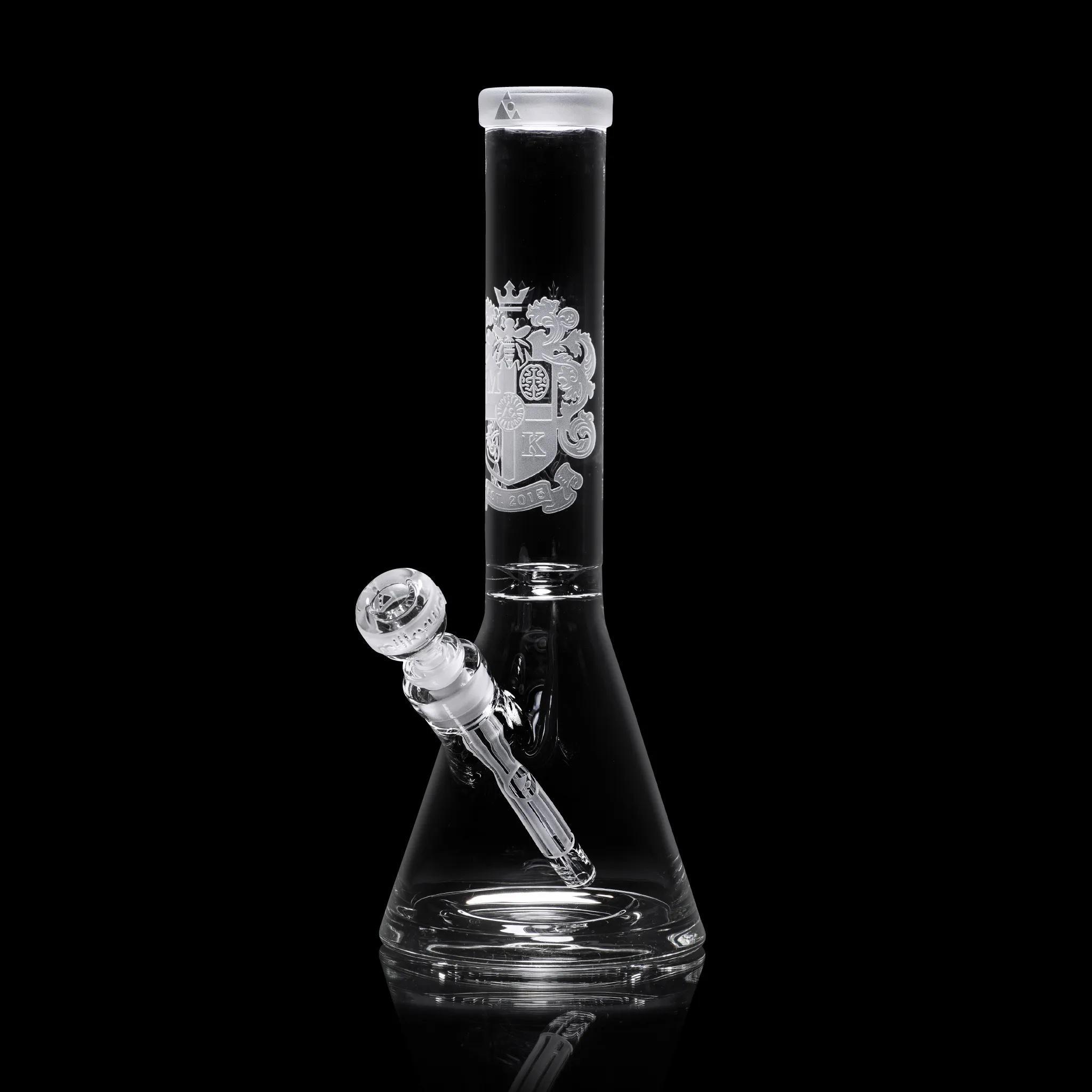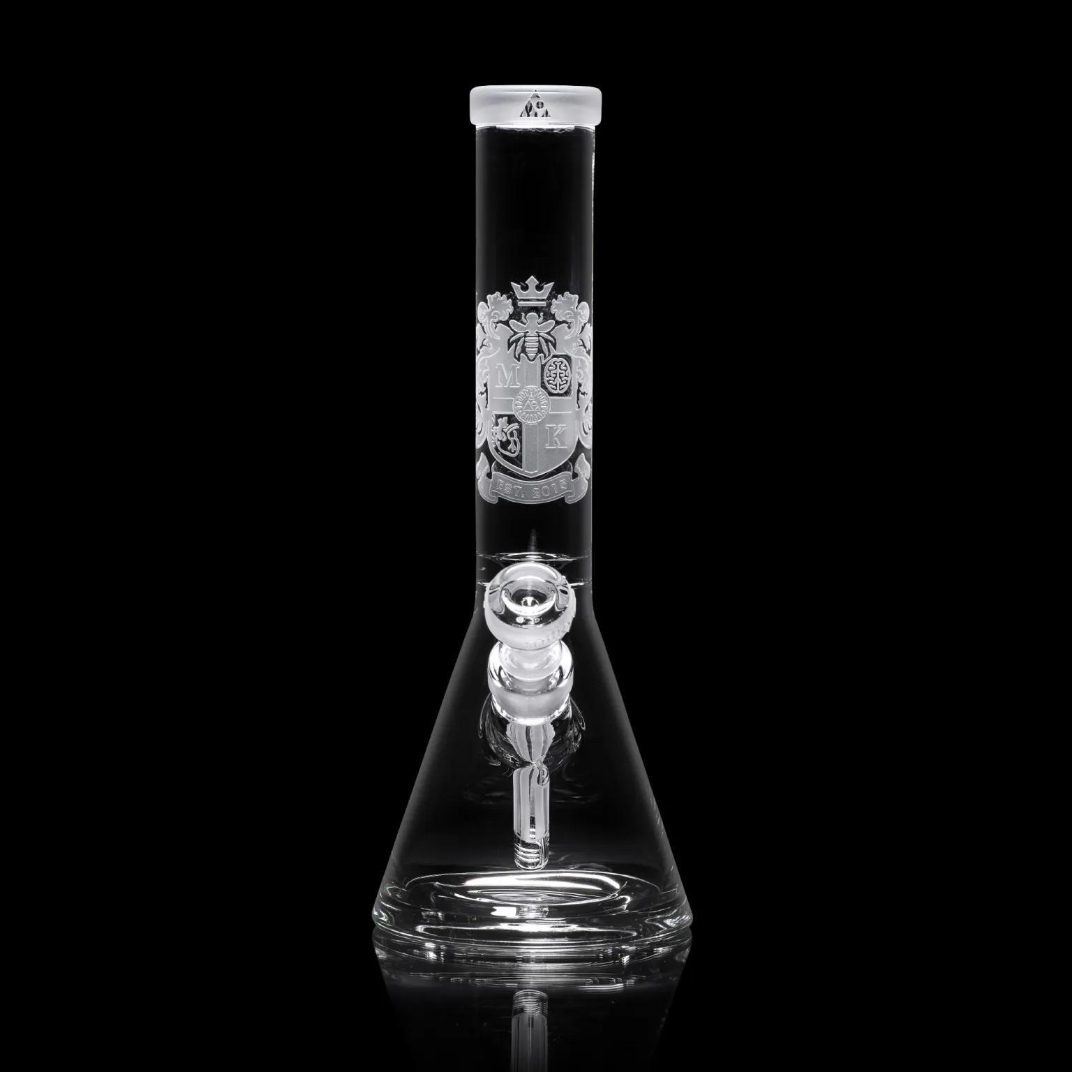 This 14″ beaker is centered around a super thick 15mm base (it’s the thickest we’ve made). It’s decorated with our traditional coat of arms design, celebrating our conception in 2015.