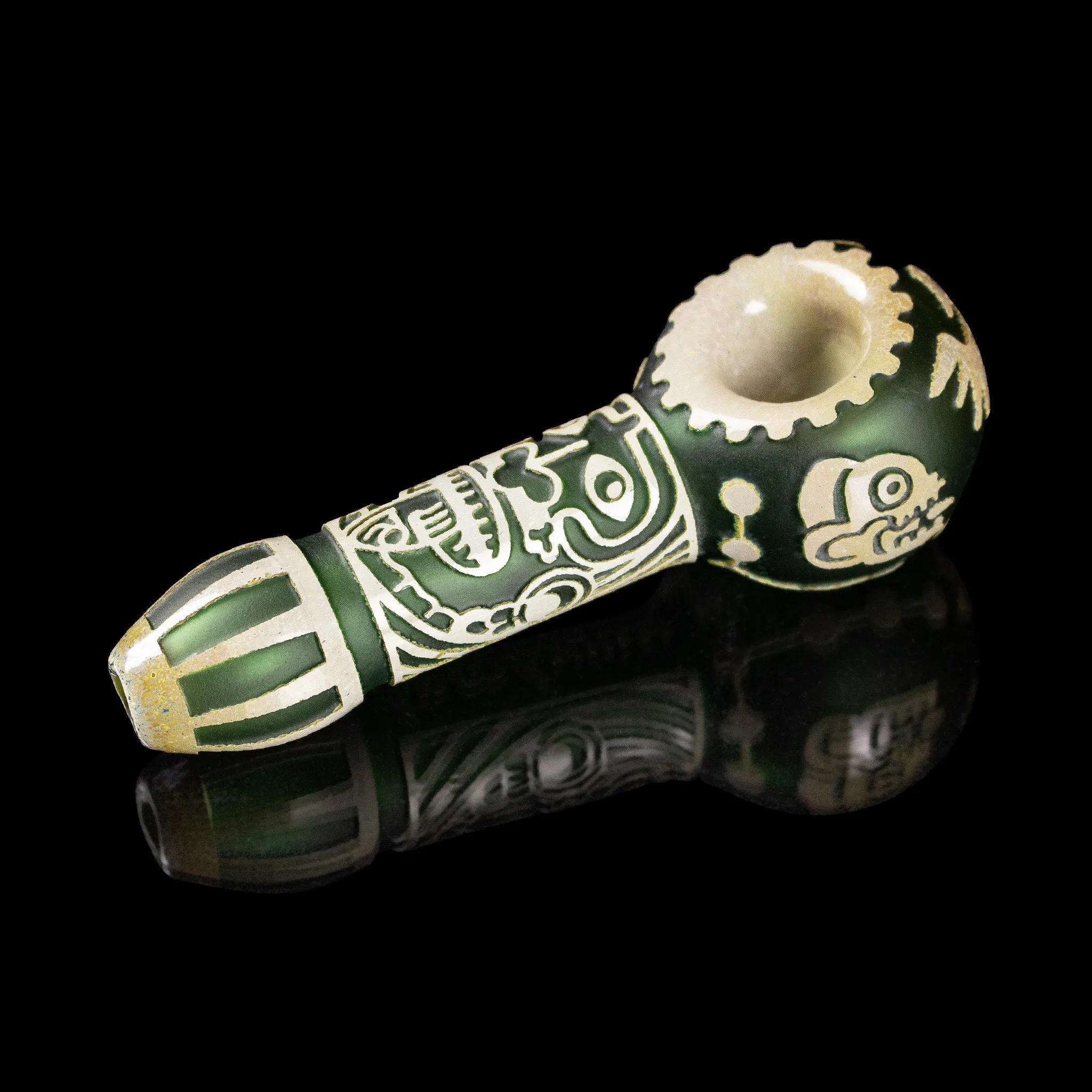 Journey with us in to an ancient world of rituals and sacrifice.. This 4.5” handpipe contains our popular Maya theme. With an incredible amount of detail, this is the perfect handpipe for anyone who already owns our Maya Fort beaker or Mini Maya beaker. This color layered handpipe is very strong and sandblasted super deep for maximum grip.