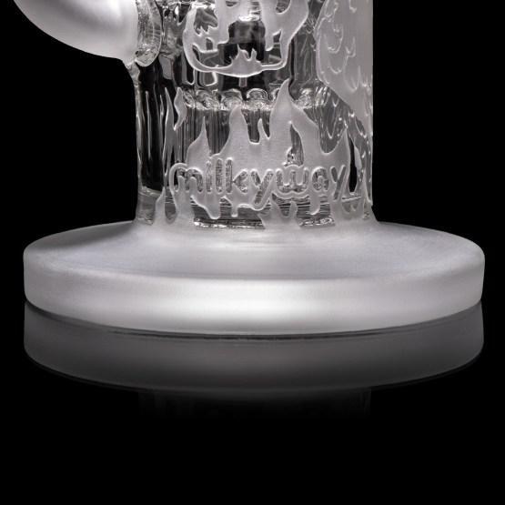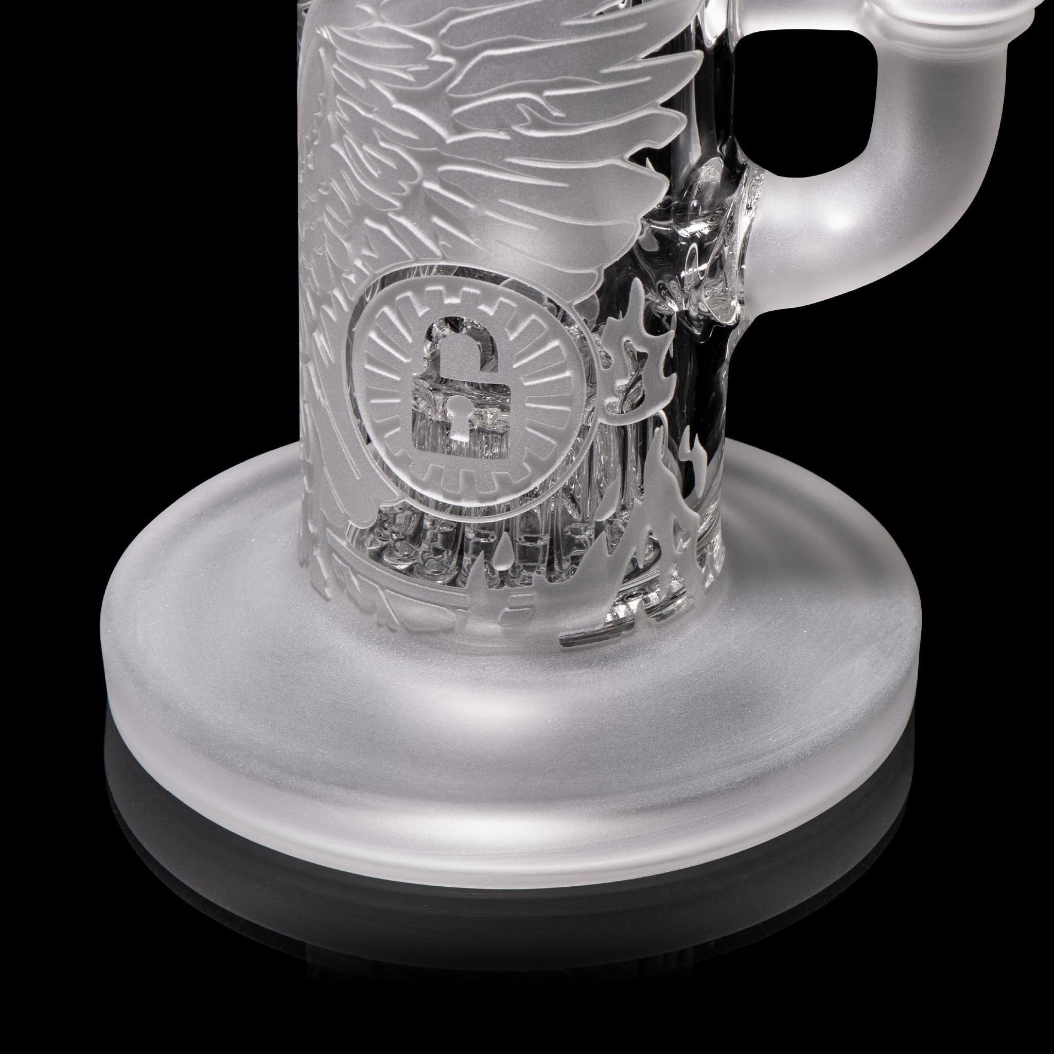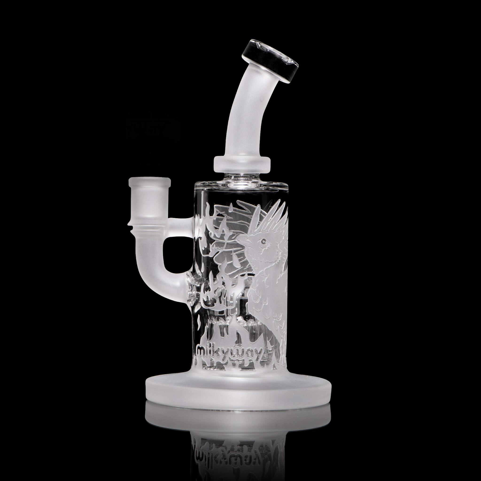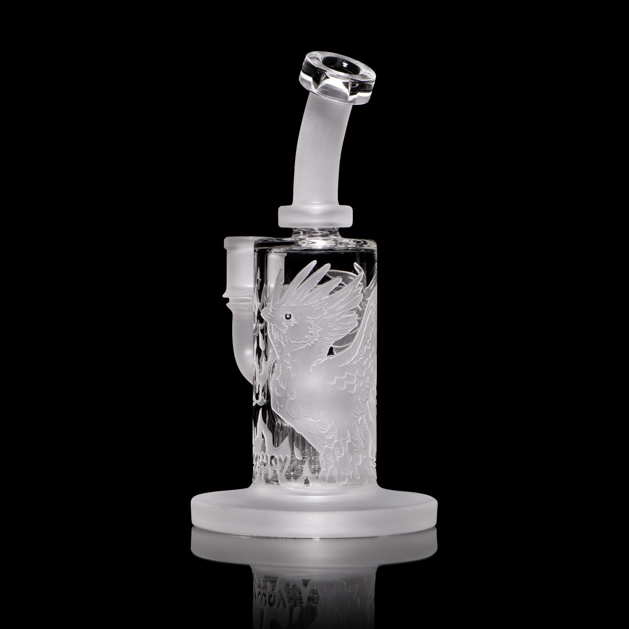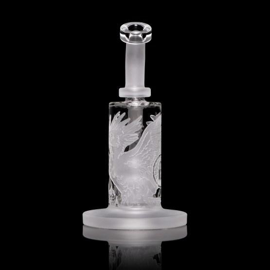The Chronicles of Kush: Vera – Version 2.0. This bubbler depicts the legend of Vera the Phoenix in a fiery inferno. Vera is the last of her kind and the origins of her species are unknown. This 8” bubbler contains a down-tree perc and stacks a lot of bubbles. Stay tuned for more from the Chronicles of Kush..