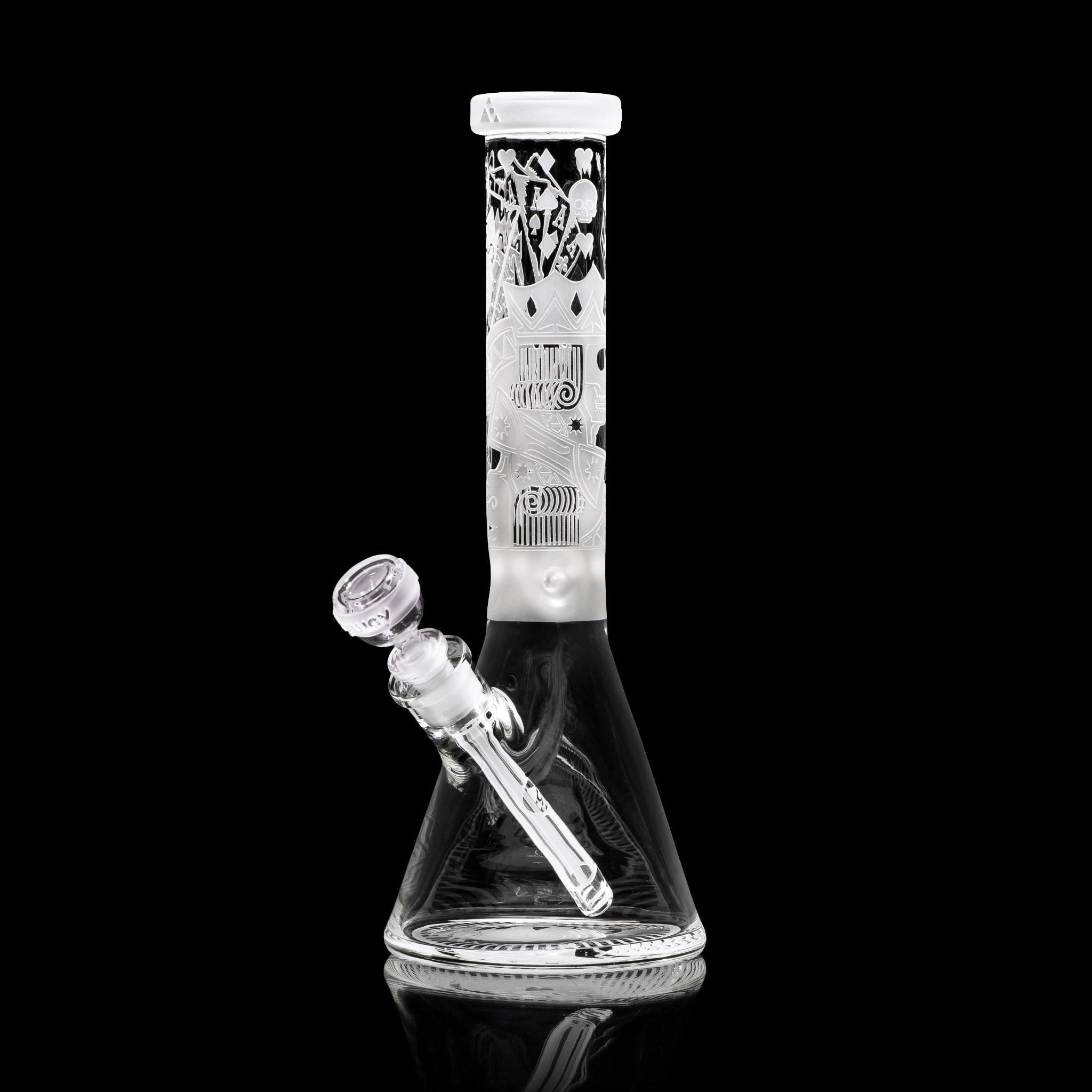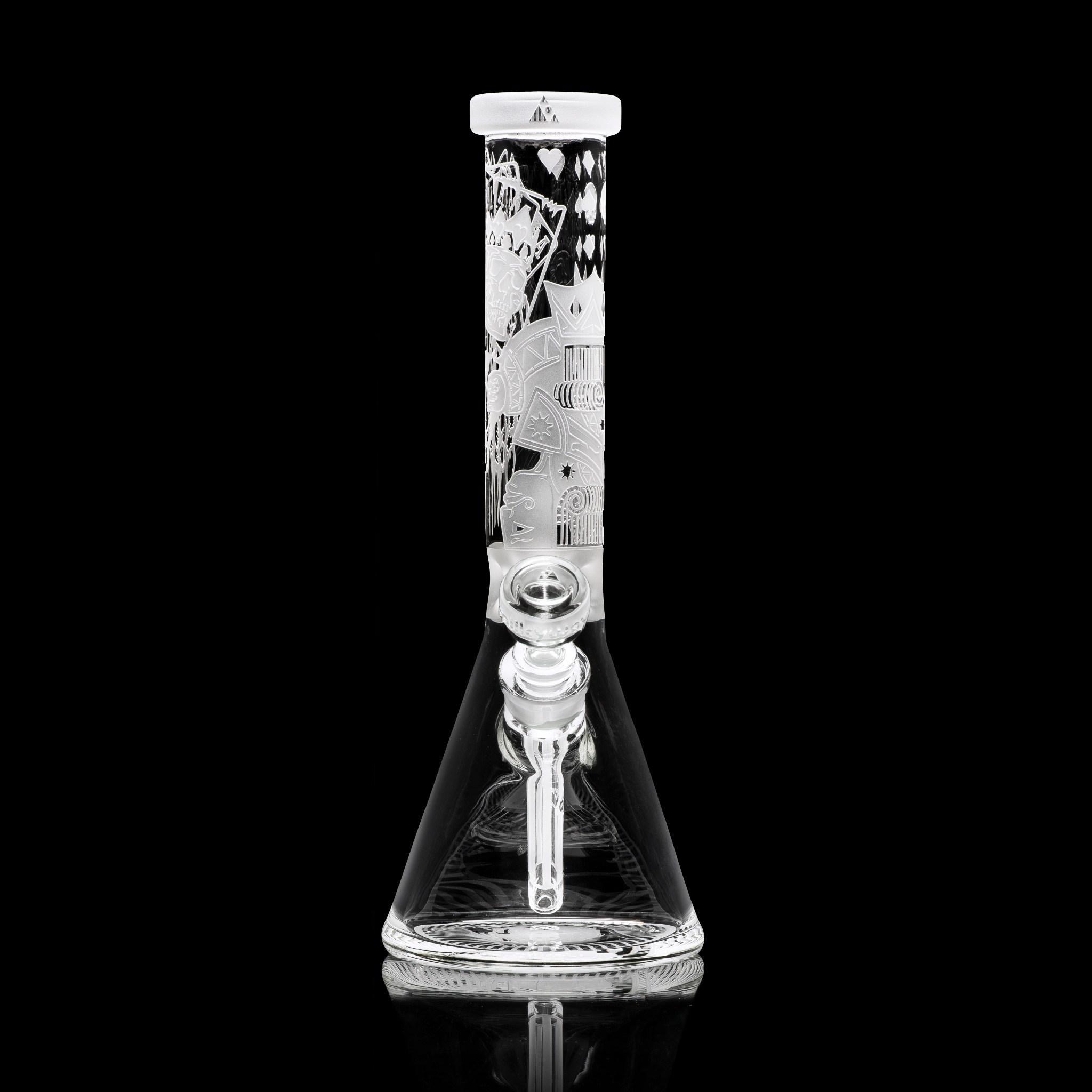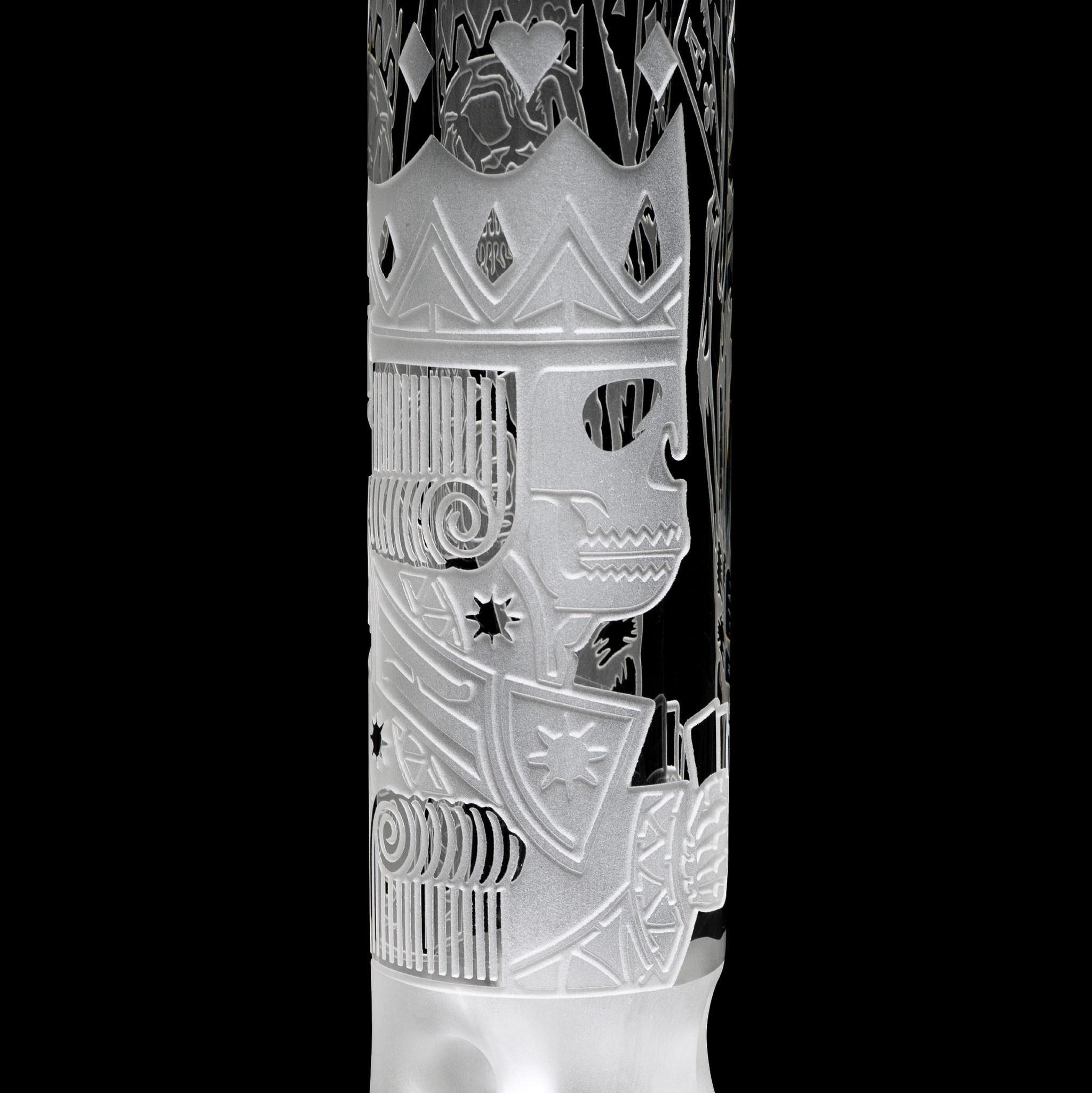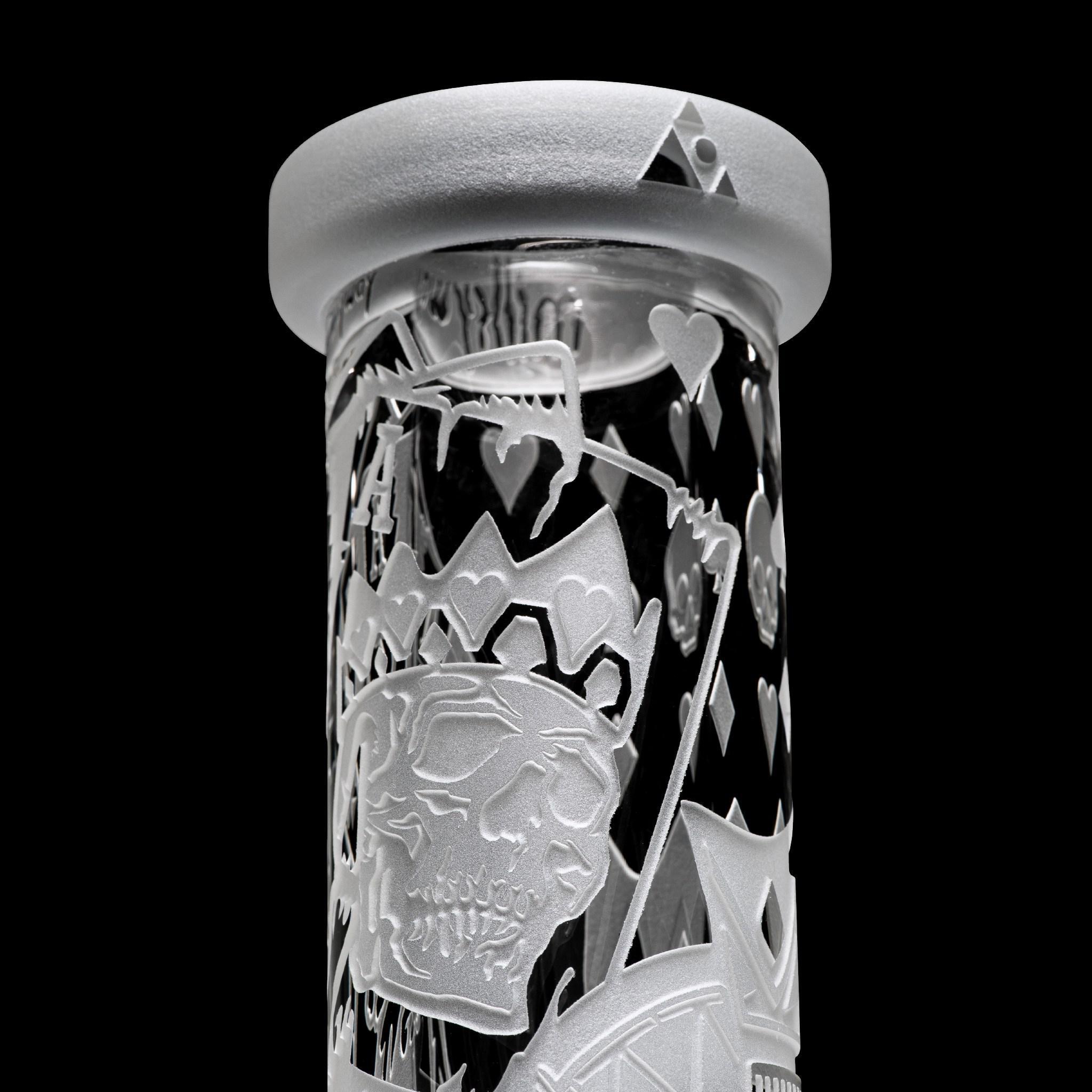Inspired by games of chance and tyrant kings, this 15” beaker depicts a card game between King Horan and Death himself… With deep sandblast details on a clear tube and base, this beaker makes a nice addition to any skull lovers collection.