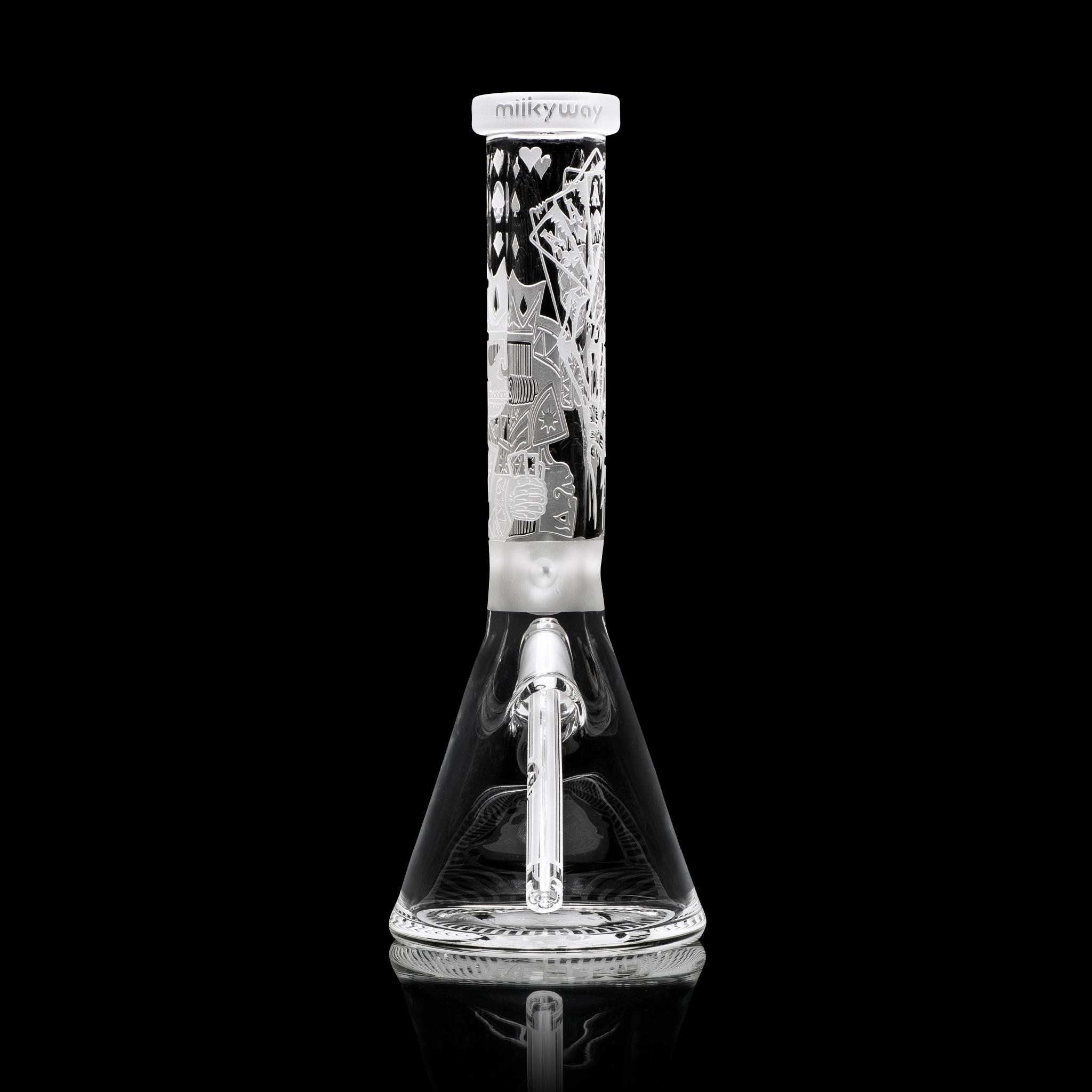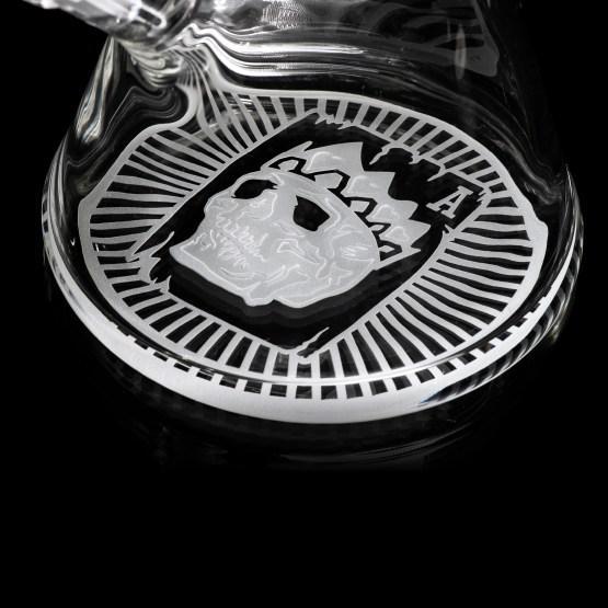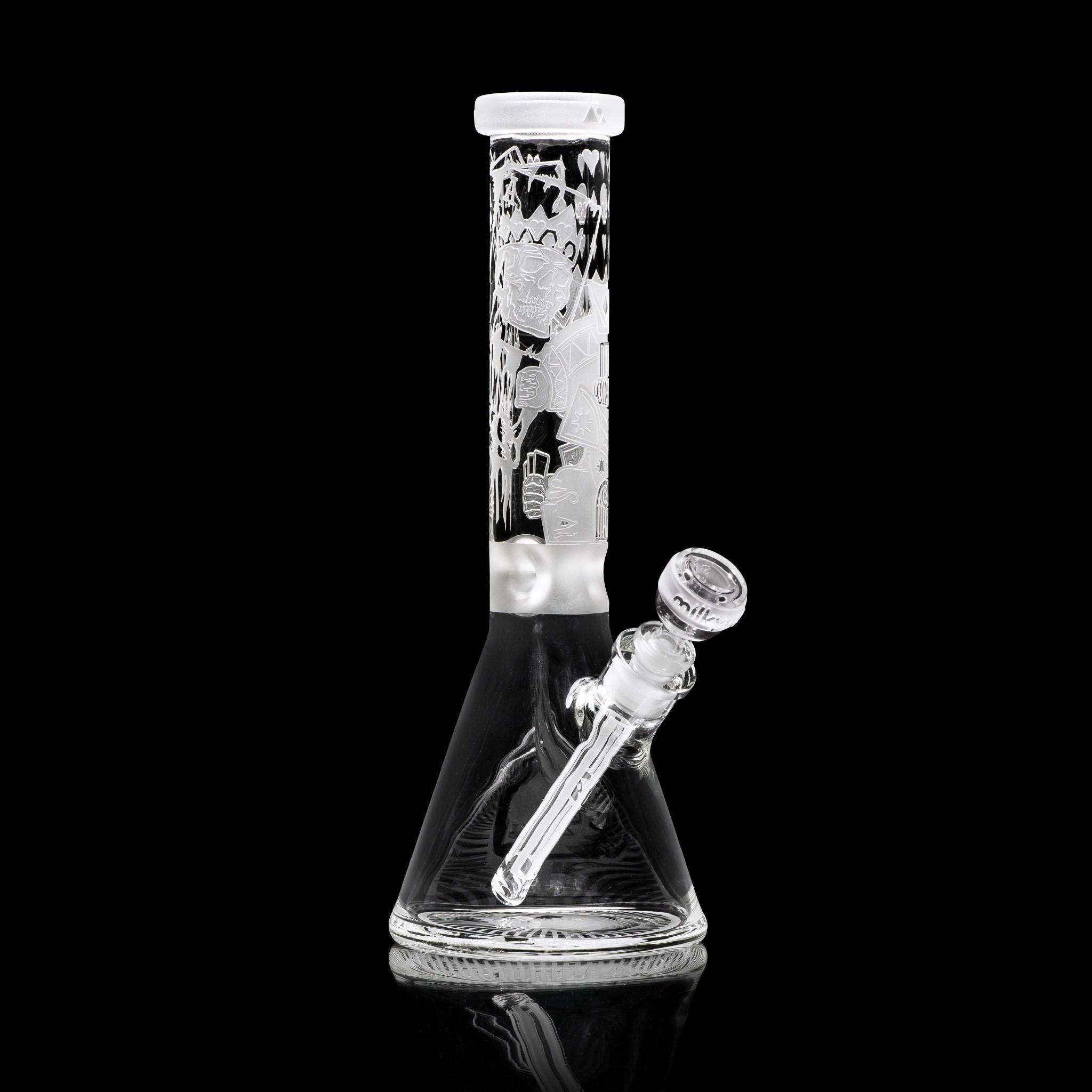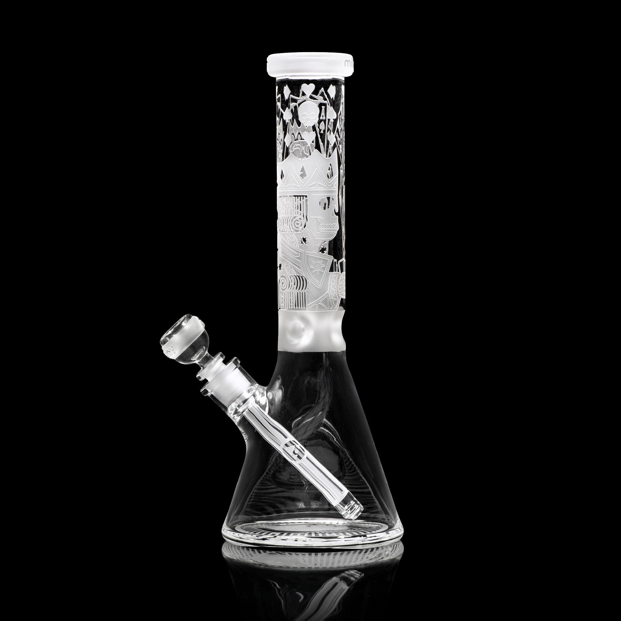 Inspired by games of chance and tyrant kings, this 15” beaker depicts a card game between King Horan and Death himself… With deep sandblast details on a clear tube and base, this beaker makes a nice addition to any skull lovers collection.