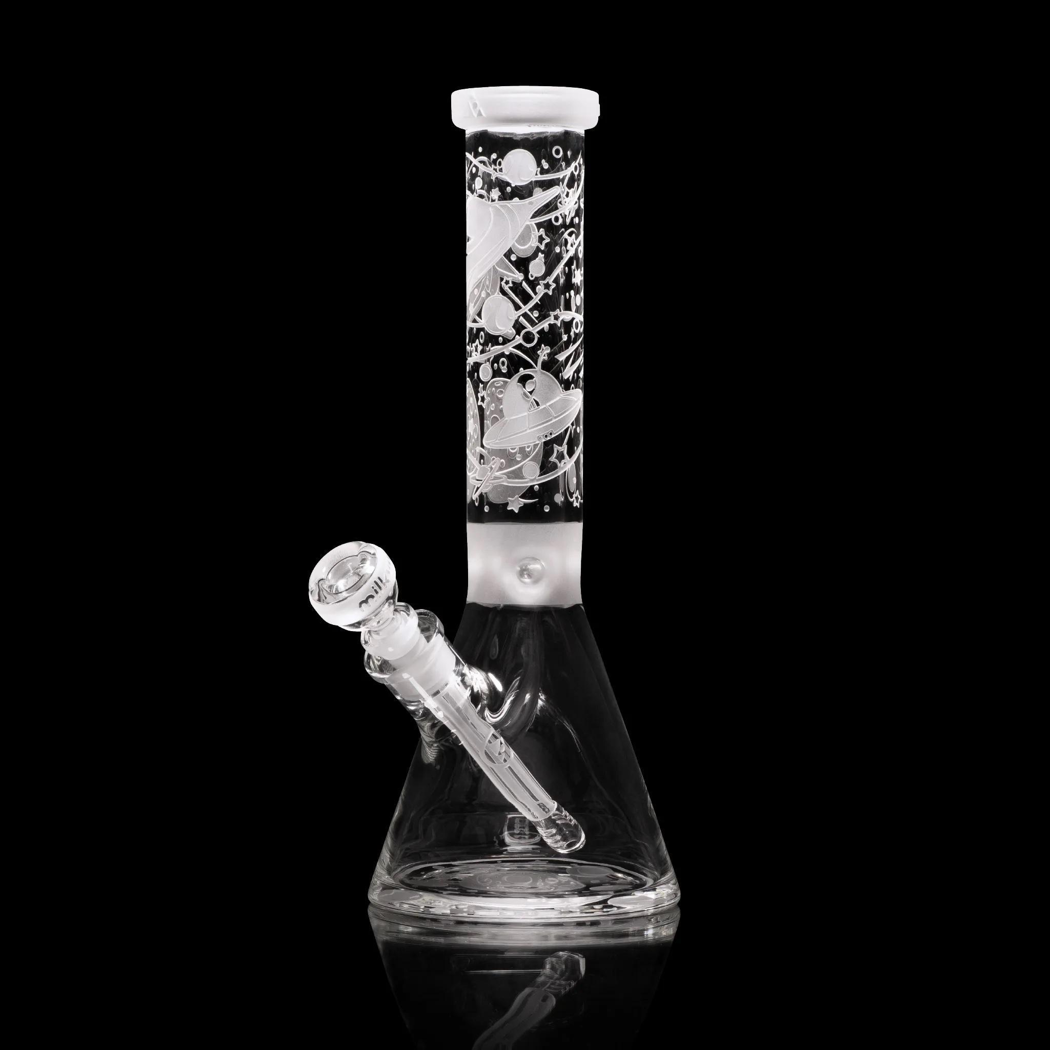 Space Odyssey: First Contact – Join us as we venture deep into the cosmos on a voyage in search of aliens and strange planets… At 14” tall, this beaker contains sandblasted elements on the main tube and base. If you look at the tube, you’ll see we’ve just made first contact. This is the second installment of a cosmic adventure series we call ‘Space Odyssey’. Stay tuned for the next episodes.