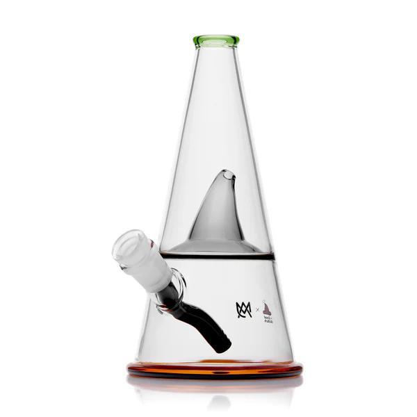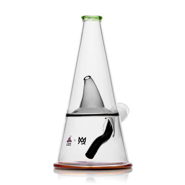 Step into the realm of mystical transformations with The Alchemist, a cauldron simmering collaboration between MJ Arsenal and A Good Witch (@agoodwitchofficial). This enchanting bong combines ancient sorcery with cutting-edge design, featuring a captivating witch hat in the central tier, guiding smoke through a magical chimney system reminiscent of a cozy winter cabin. As the smoke percolates through the lower chamber and rises, it travels only through the narrow witch hat passage, delivering an exceptionally smooth and controlled rip. Adorned with a 14mm broomstick downstem/slide and accented with an earthy green mouthpiece and amber base, The Alchemist invites you to conjure the smoothest sessions and elevate your rituals to new, mystical heights.