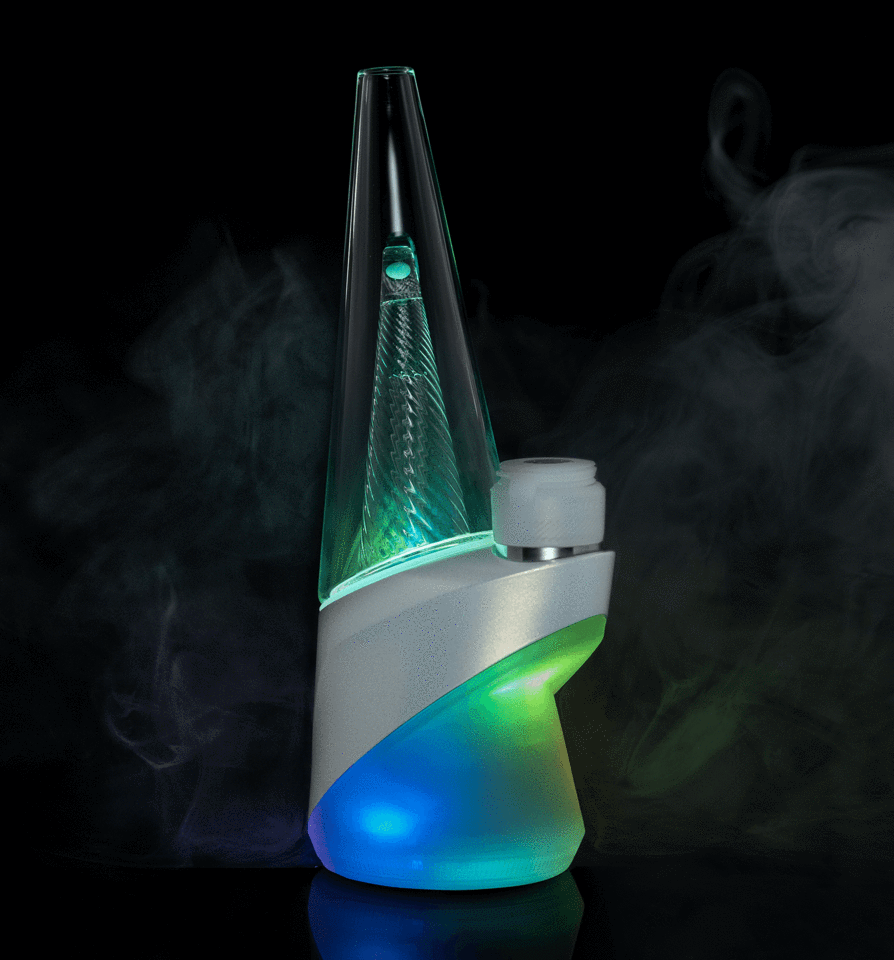 The Opal LE Peak Pro is both subtle and complex. A smooth purple and blue gradient fades over the translucent silicone base and the metal band and then continues upward as it meets the sacred geometry inspired blow molded inner dome and outer cone glass.