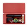 The Travel Case keeps your stash organized. Featuring a ridged hard aluminum exterior with a magnetic lid closure and soft silicone inside to reduce rattling, the Travel Case has room for a Pivot + Hot Knife, up to 3 jars, cotton swabs, a covered section for trash, and anything else you might need.