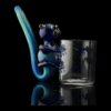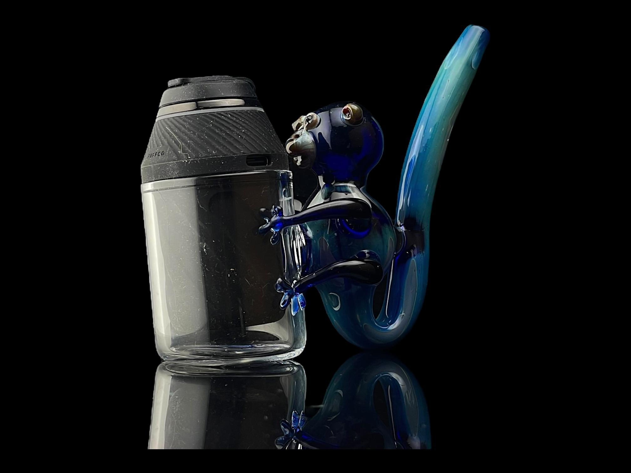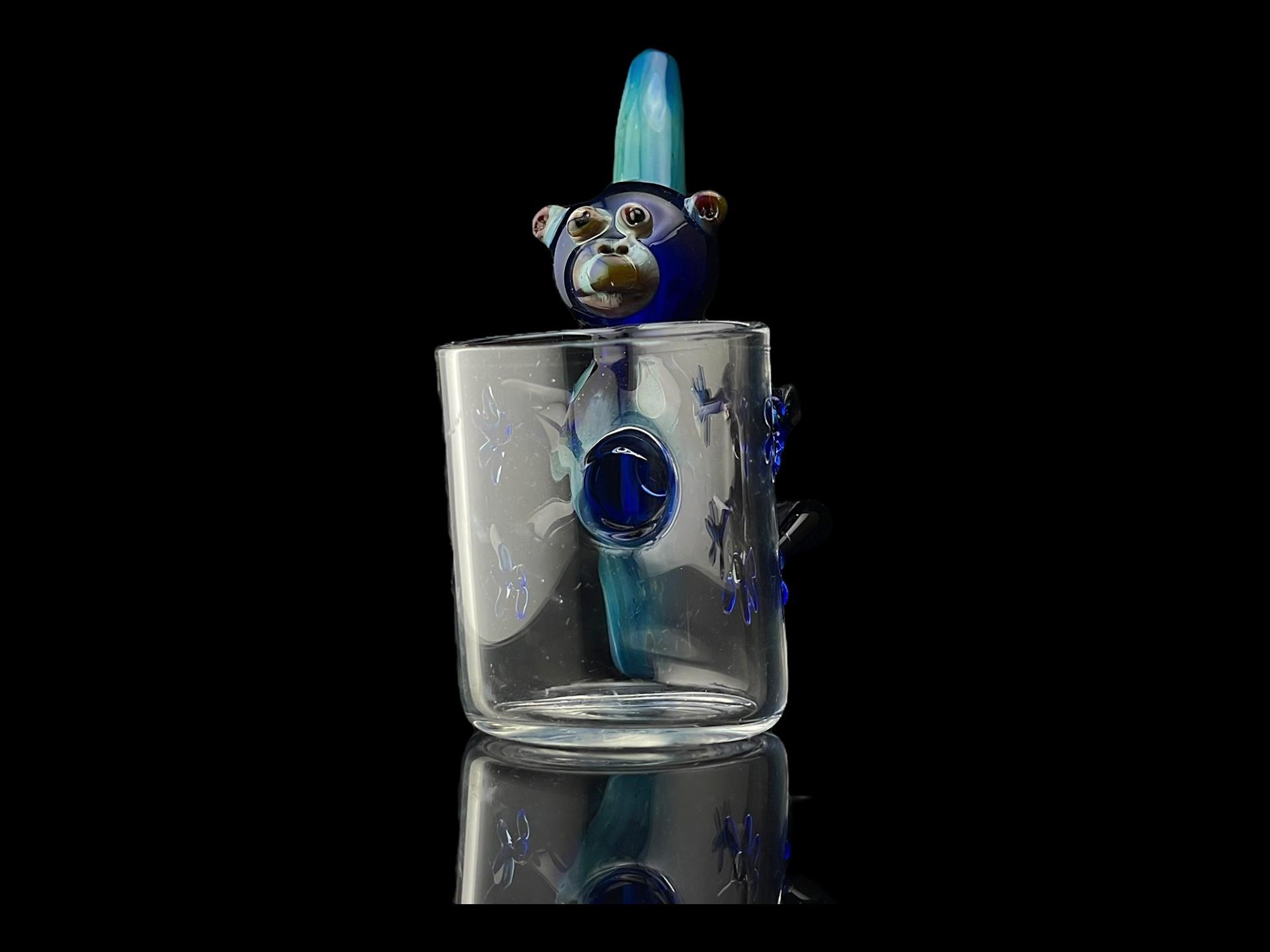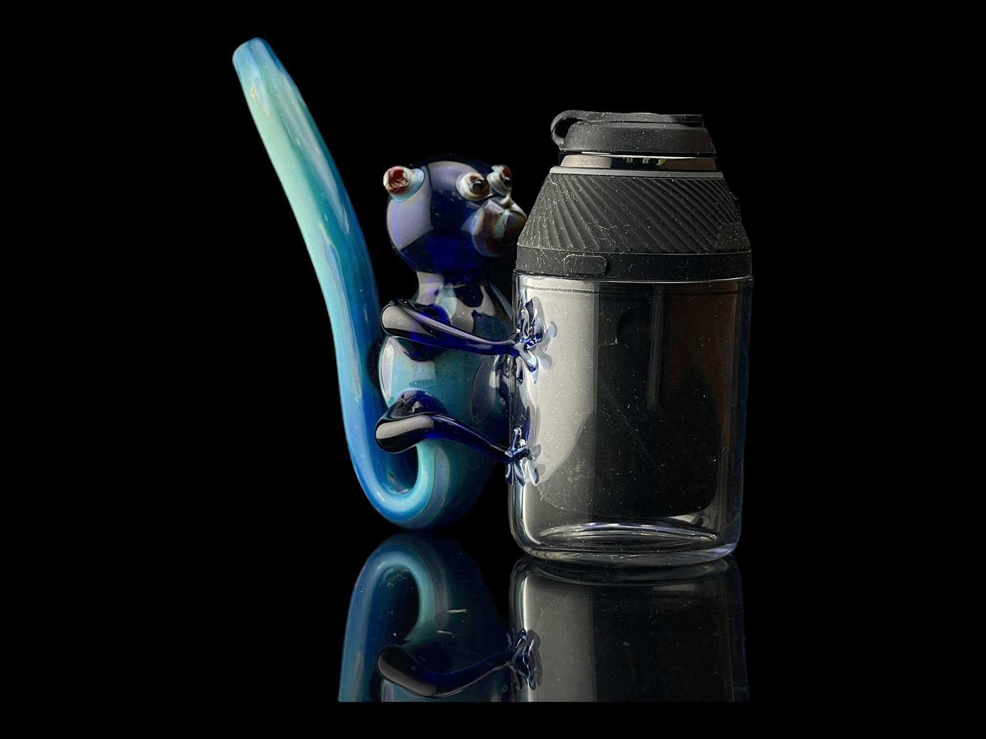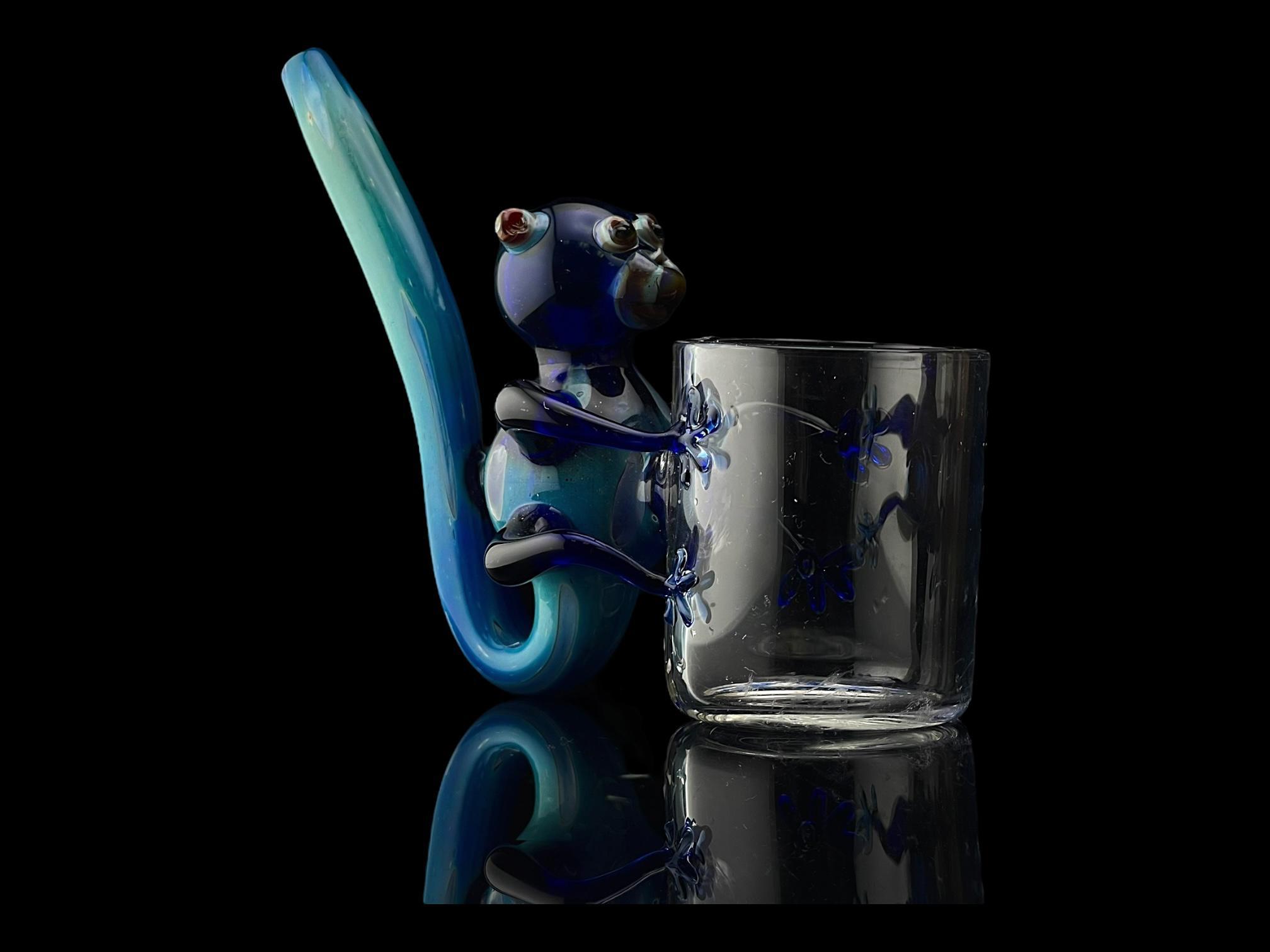 Get curious with your new primate pal! The Blue Monkey Bubbler is made from borosilicate glass with a flat base so it can stand up when not in use. This fun take on a sherlock style pipe is fully functional, with a blue monkey grappling the side of your Proxy chamber! A multi-hued swirl makes up the slim tail mouthpiece. Bubblers let you bridge the gap between dry proxy dabs and water filtered ones! These straightforward pieces are perfect for casual and frequent smokers alike.