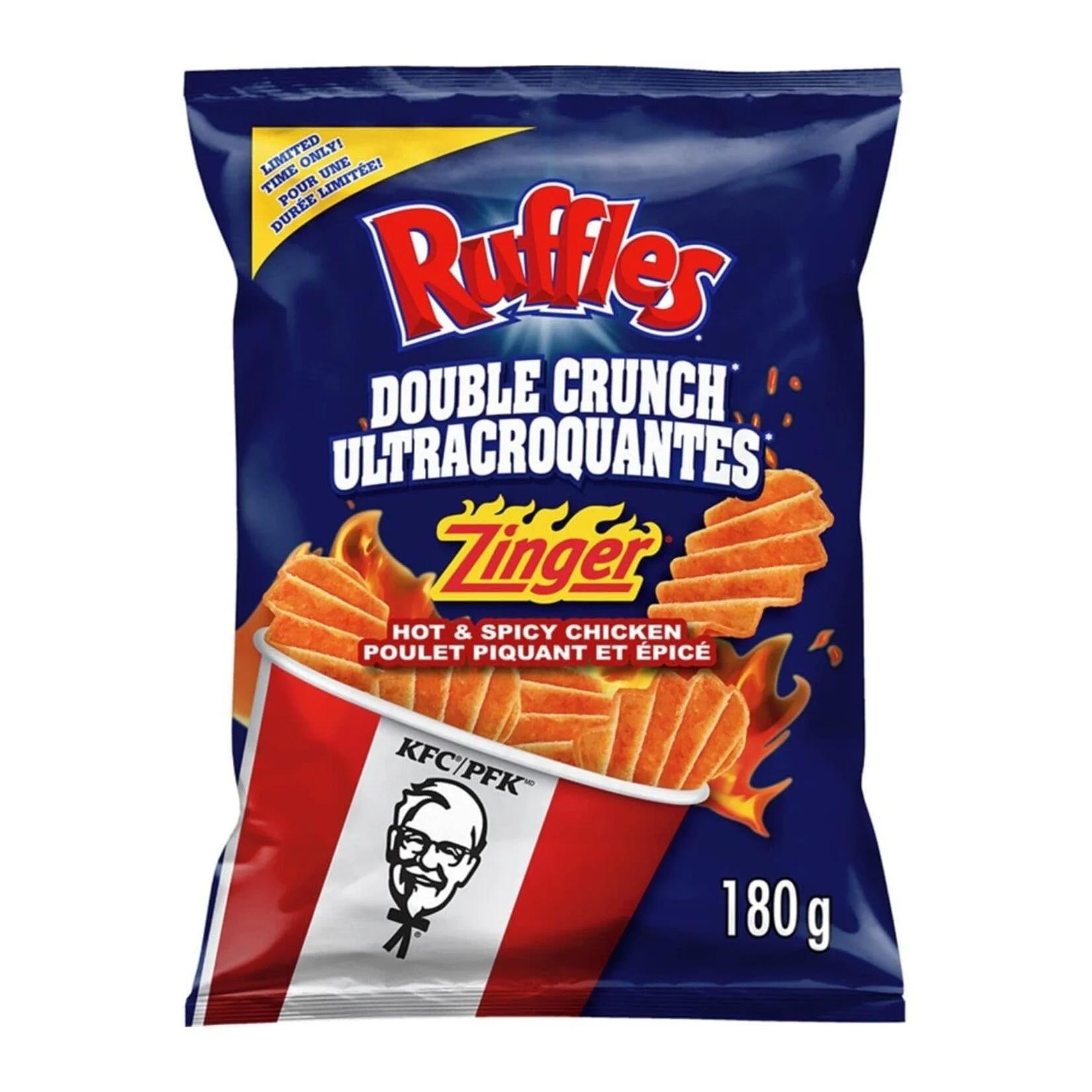 Ruffles Double Crunch KFC Zinger Hot & Spicy Chicken flavoured potato chips deliver a fiery kick and satisfying taste in the deep-cut ridges of our ultra-crunchy chips. An intense snacking experience, the taste is inspired by KFC’s Zinger Hot & Spicy Chicken. Take a bag to your next get-together to share a tangy, zesty snack with a mouthwatering kick. These chips are next-level snacking perfection, so turn up the heat with a flavour experience like no other. With zero trans fat and no artificial flavours or colours. Available for a limited time.